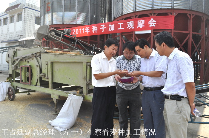 825,安徽皖垦种业股份有限公司在潘村湖农场召开2011年种子加工观摩会,来自皖垦种业本部及其旗下的13家分公司领导考察观摩了明光分公司小麦种子加工中心生产情况,汇报交流了各分公司工作进展情况,并就切实抓好今年小麦种子加工工作,保障种子质量,实现以质促销目标进行了座谈。会议由皖垦种业股份有限公司副总经理吴久好主持,潘村湖农场场长柏华胜致欢迎辞。省农垦集团副总经理、皖垦种业总经理王占廷到会并作讲话。