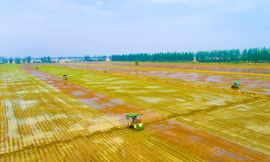 眼下,在大圹圩农场公司水稻高标准种植示范基地,20余台插秧机穿梭游走,驶过之处,一排排绿油油的秧苗整齐的矗立田间,放眼望去生机勃勃,满是希望。