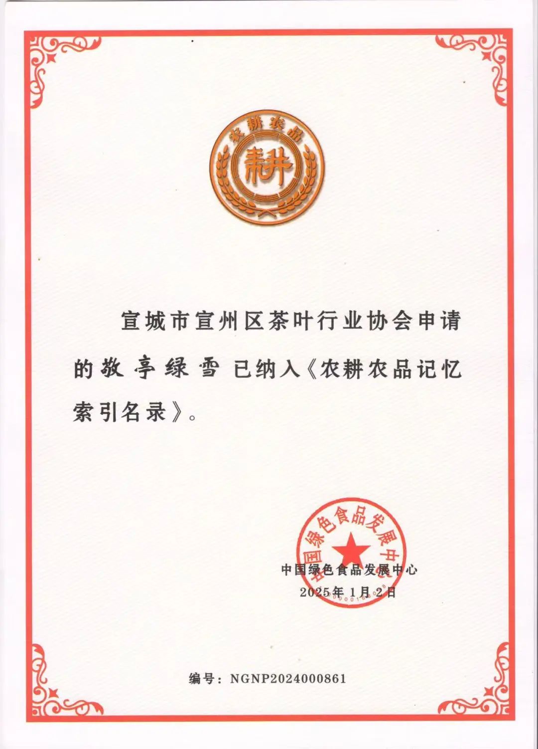 近日,敬亭绿雪茶被纳入中国绿色食品发展中心《中国农耕农品记忆索引名录》。