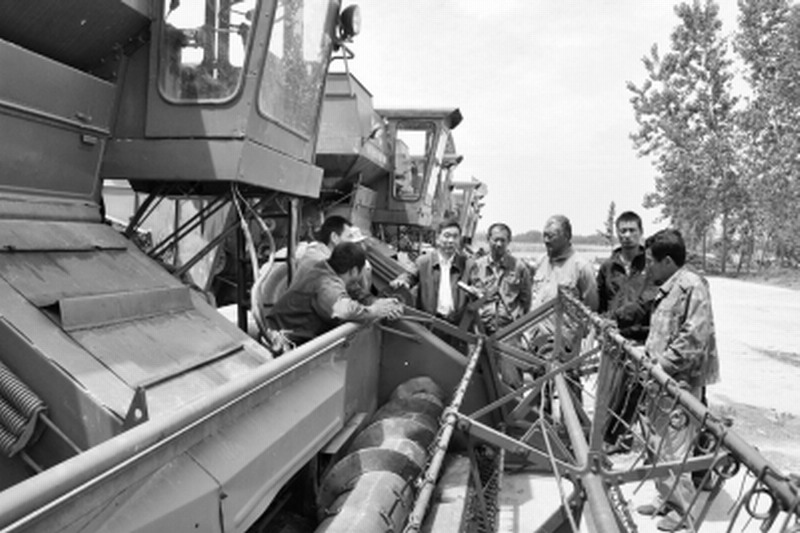 安徽农垦潘村湖农场麦收时节,260多台大马力收割机已检修完毕全部投入一线。连日来,农场组织资深农机人员进村入户,现场培训收割机手,以进一步提高机手操作水平,确保颗粒归仓。图为农场高级工程师汪长银正在为机手讲解收割机操作规程。(杨登宏摄)
