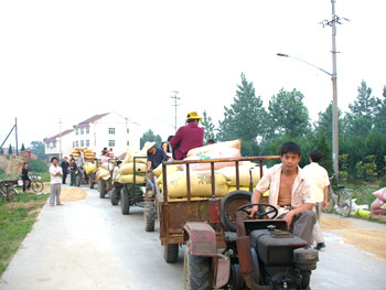 怀远县龙亢镇及徐圩乡农民踊跃向龙亢农场雁湖面粉公司开办的“粮食银行”储存小麦。为方便周边农民销售小麦,保护广大粮农的经济效益,近几年,雁湖面粉公司开办了“粮食银行”:就是为周边农民的小麦提供储存仓库,3个月后随时按当日的现价和粮农结算粮款,也可以兑取面粉,此举大大方便了广大农民,同时也为该公司提供了更多的原料,实现“双赢”的目的。