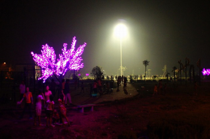 66晚,龙亢农场镇区广场上新安装了高杆灯和六棵桃花树灯,点亮了职工群众夏夜新的生活。巨大的高杆灯矗立在广场中央,灯光如银,银辉倾泻;六棵桃花树灯散布在广场的三个拐角,每两棵相伴相依,灯光妖娆,缱绻缠绵。撩人的景观灯光交融在广场周边的路灯光里,构筑了一副华美的镇区夏夜景观,人们在这美轮美奂的时光和灯光里总能找到属于自己的欢乐:一群女职工们在高杆灯下翩跹起舞,舞动出了和谐华章;老年人在灯光下悠然自得地散步,惬意感受着幸福美满的暮年生活;小朋友们围着桃花树追逐嬉戏,在这个快乐时光里不时发出天真无邪的笑声……
