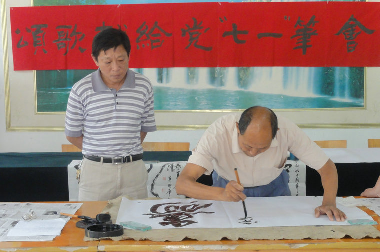 农场书法爱好者们紧扣庆祝建党90周年主题,提笔挥毫,创作了“清正在德,廉洁在世”、“廉以立身,俭以养德 ”、“邦民国世,安强盛昌”等书法安徽农垦集团,热情讴歌了党的丰功伟绩。书法会展中,85岁高龄的退休老人张作江激动不已,感慨万分,一进门便从口袋里掏出自己心爱不已的红本本——党员证,兴致勃勃地谈起了伟大的党走过的光辉历程,他在工作人员的帮助下,提笔写下了“一万年太久,只争朝夕”字幅。